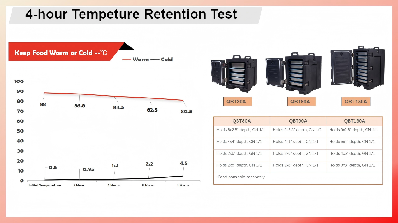 O transportador de alimentos isolado QBT130A foi projetado para manter temperaturas seguras de alimentos quentes ou frios por até 4-6 horas. O isolamento espesso e selado de poliuretano o torna ideal como caixa aquecedora de alimentos para catering, buffets e operações móveis de entrega de alimentos. Ela pode conter até (9) panelas de comida GN padrão de 2,5" ou (5) 4" padrão (vendidas separadamente). Esta caixa quente de carregamento frontal é perfeita para aquecer bandejas, panelas...